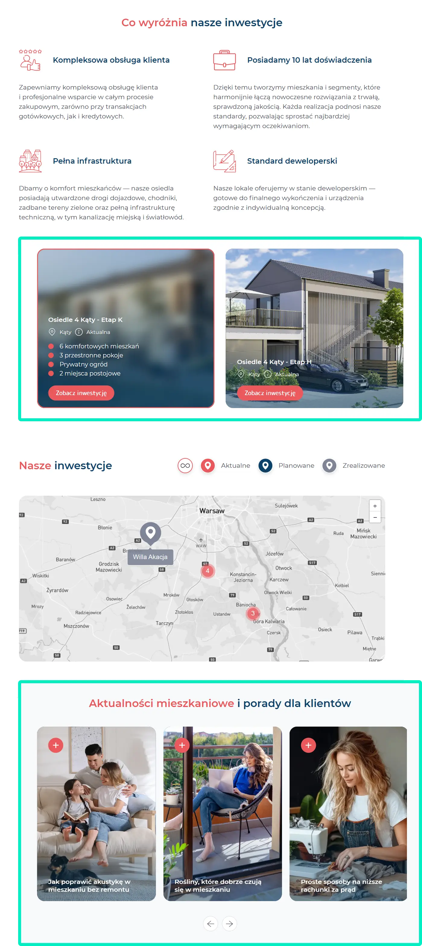 Opierając się na naszej wiedzy w tworzeniu stron ofertowych i sprzedażowych, doskonale rozumiemy „schemat” myślenia i oczekiwań klientów - szczególnie w branży deweloperskiej, w której się specjalizujemy. Strona główna i inne podstrony zawierają różne sekcje, które nie tylko urozmaicają wygląd strony, lecz również budują zaufanie i zwiększają szansę na osiągnięcie oczekiwanego rezultatu.